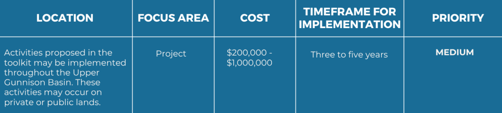 The Upper Gunnison River Basin has many existing community drought-related initiatives. This action supports continued engagement in workgroups and planning processes relating to drought mitigation.