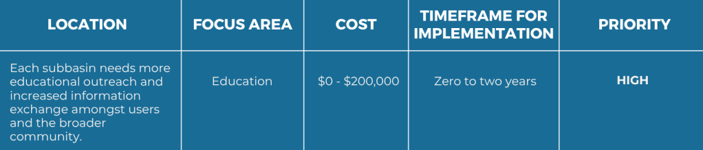 This action seeks to make this data more widely available and accessible, especially to newcomers to the basin. This action will raise awareness of opportunities for the agricultural community to work with partners in implementing programs that support improved management practices and drought resilience.