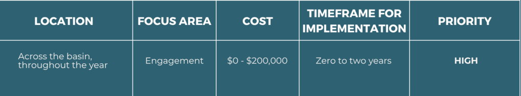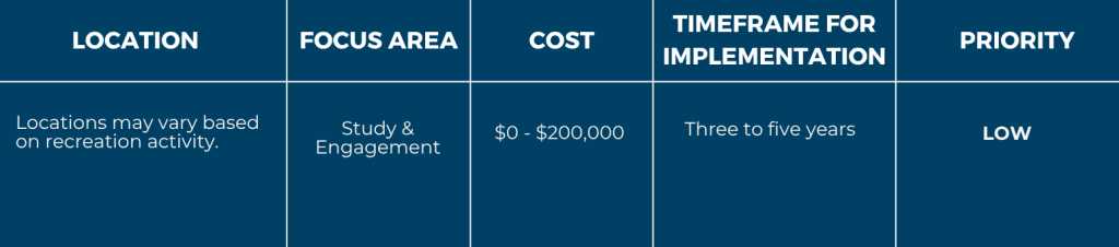 One goal of the plan could be to provide information to users about the ideal times to recreate based on water levels, where recreation can be accessed, what to expect in terms of different management based on land ownership, and education on river etiquette and safety across a wide range of river flows. This work can be aligned with statewide initiatives like the Colorado Water Conservation Board and American Whitewater’s Quantifying Recreational Impacts and Identifying Enhancement Opportunities Phase 2.