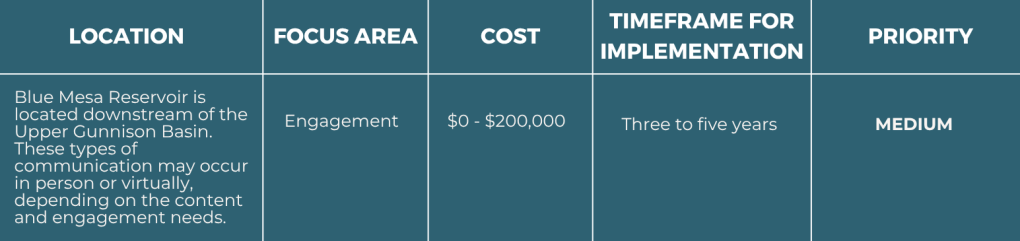Improve communication between the Bureau of Reclamation, Upper Gunnison Basin water users, and the public. The community seeks additional communication around annual operations, management of releases for Drought Response Emergency Releases, and operations associated with winter icing protocol(s).