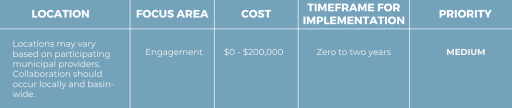 Encourage and support the development of a drought response plan for municipal providers. This planning process would allow municipal water providers to convene routinely to discuss not only drought response actions but also to share information and collaborate on other projects.